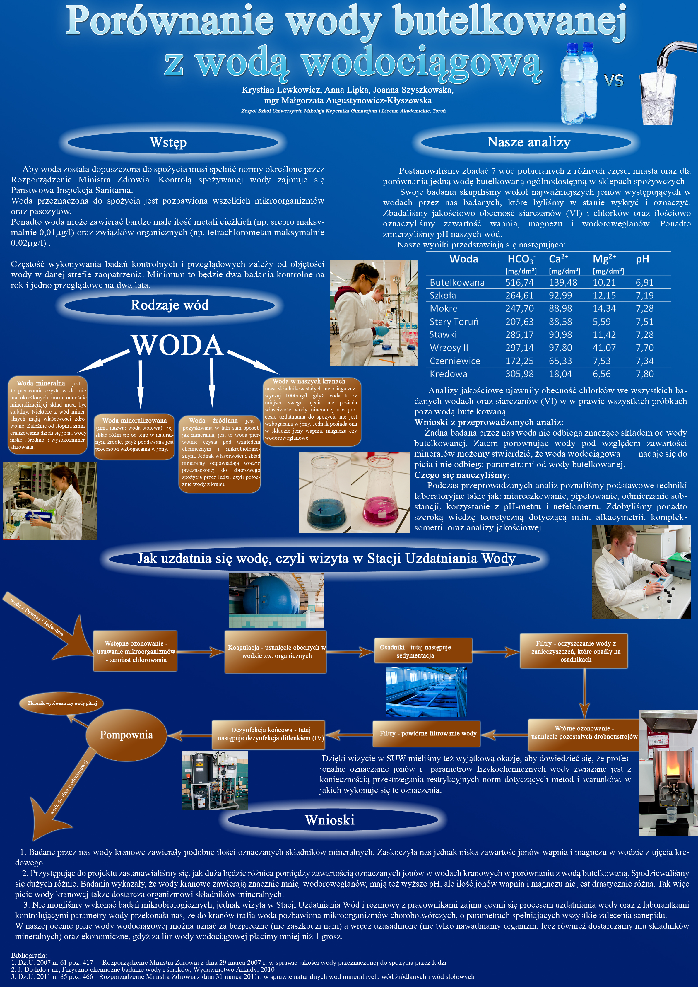 • Lipka Anna, Lewkowicz Krystian, Szyszkowska Joanna, klasa 3bL – Porównanie właściwości fizykochemicznych wody butelkowanej i wody wodociągowej